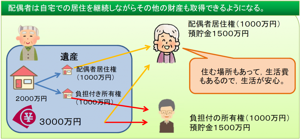 改正法では、 ①相続人全員の合意がある場合、または、②「配偶者が希望し、かつ居住建物の所有者の受ける不利益を考慮してもなお配偶者の生活を維持するために特に必要があるとき」 には、居住権の相続が認められるようになりましたので、(一方で、子は負担つき所有権を相続します)配偶者は、自宅に居住しながらも、相続できる預貯金が増えることになりました。