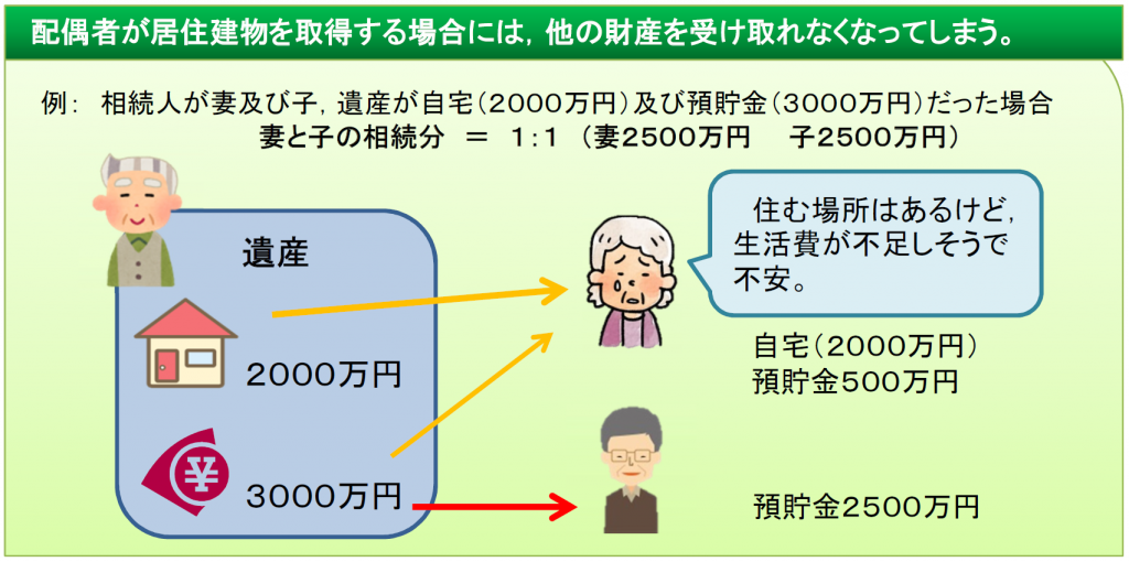 現行制度では、亡き夫の遺産である自宅(2000万円)と預貯金3000万円を妻と子2人が相続する場合、法律通りに相続するとなると、妻の相続分は、2分の1の2500万円です。住みなれた自宅に住み続けることを選んで自宅を相続した被相続人の妻は、預貯金は、500万円しか相続できません。